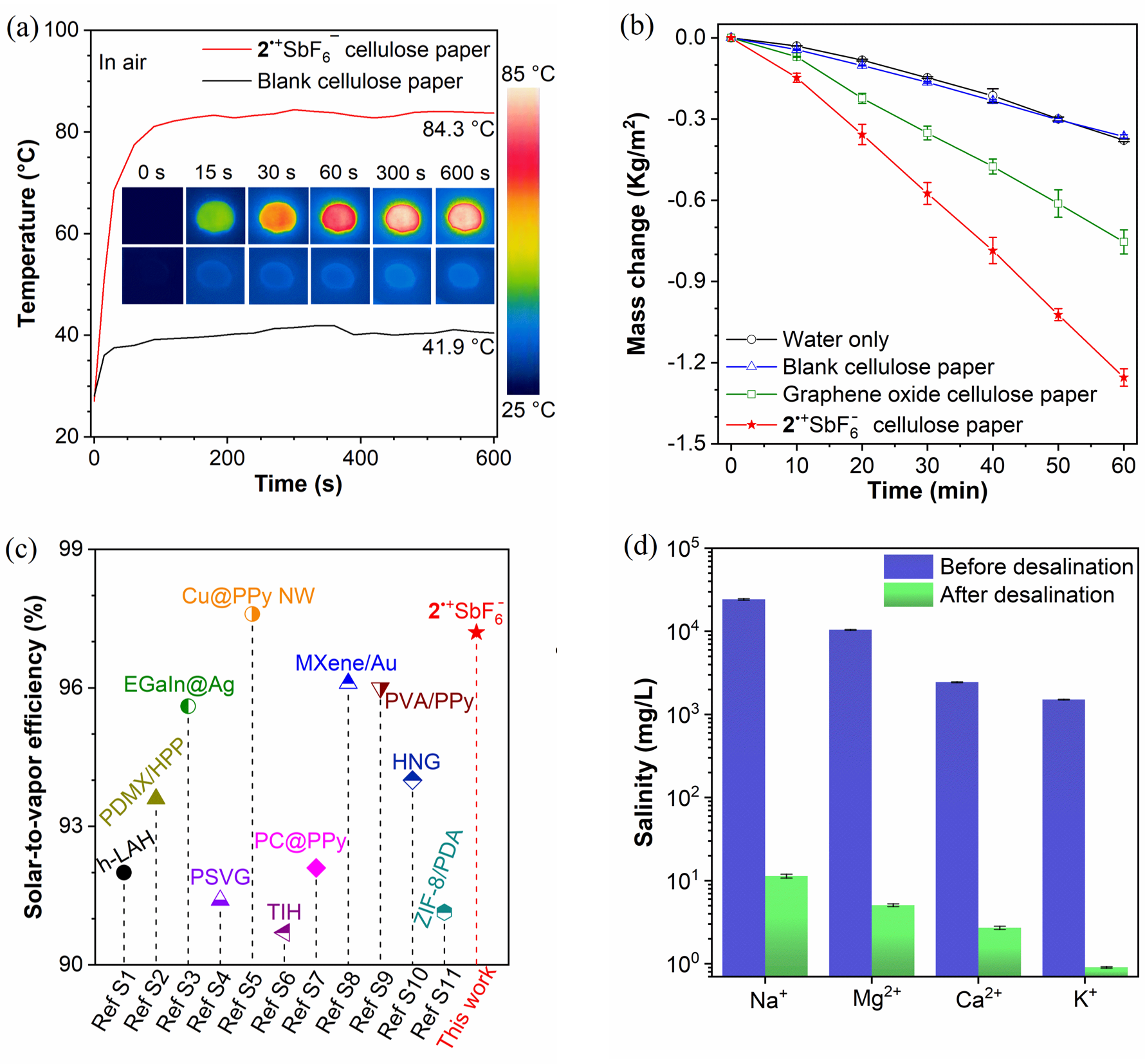 图1:(a)空白纤维素纸和负载2•+SbF6⁻的界面蒸发体系在模拟太阳光照射下的光热转换行为,插图为相应的红外热成像图;(b)纯水、空白纤维素纸、氧化石墨烯和负载2•+SbF6⁻的界面蒸发体系的水蒸发曲线;(c)已报道的太阳能驱动水蒸发材料的太阳能蒸汽转换效率;(d)海水在太阳能脱盐前(蓝色)和脱盐后(绿色)的离子浓度变化。