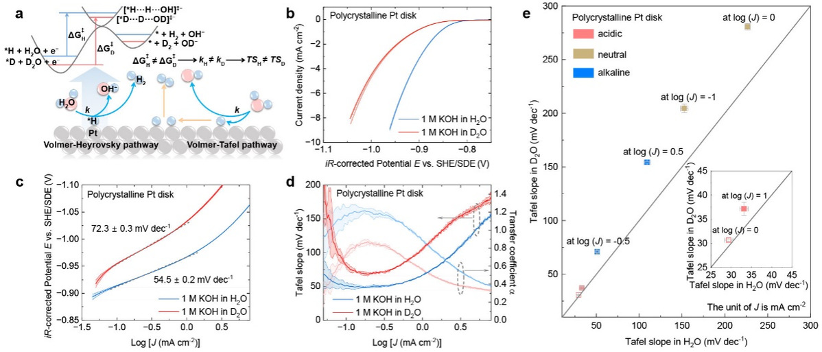 哈工大全媒体(商艳凯 王然/文 航天学院/图)近日,我校航天学院复合材料与结构研究所、哈工大郑州研究院宋波教授团队与美国威斯康星大学麦迪逊分校金松(Song Jin)教授团队合作在电催化水分解领域取得重要研究进展。研究团队创新性地利用氢同位素标记技术结合电化学分析手段,精准揭示了水分解反应中质子转移的微观动力学机制,为设计高效制氢催化剂提供了全新的理论工具。相关研究成果以《同位素依赖性塔菲尔分析探究电催化水分解中的质子转移动力学》(Isotope-dependent Tafel analysis probes proton transfer kinetics during electrocatalytic water splitting)为题在线发表在最新一期《自然化学》(Nature Chemistry)上。