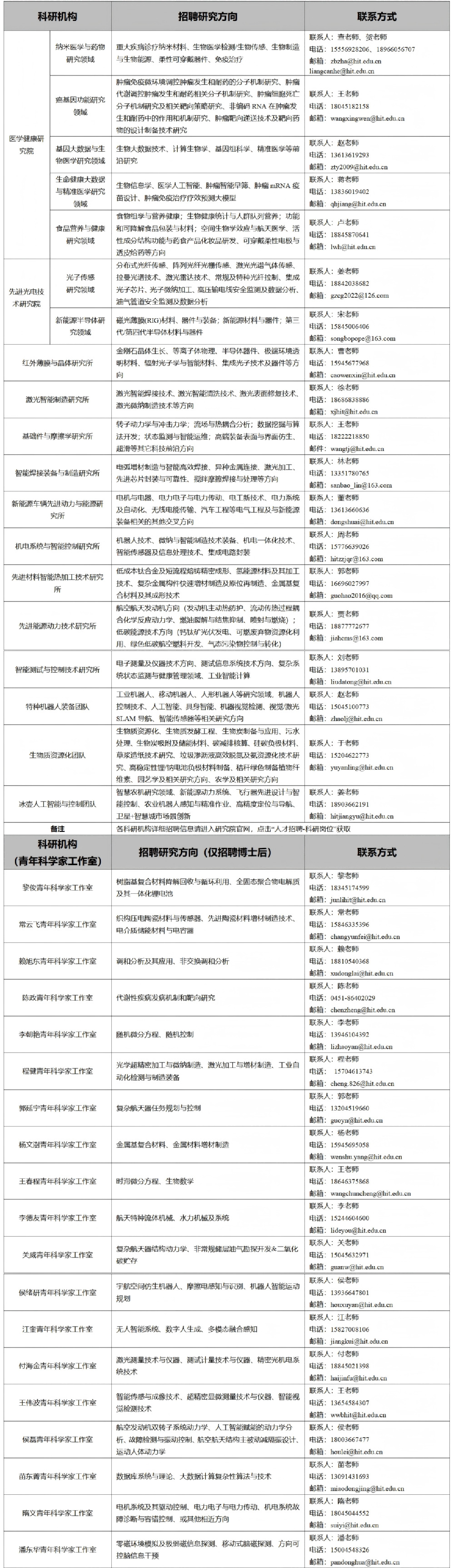 七、研究院各科研机构招聘方向及联系方式