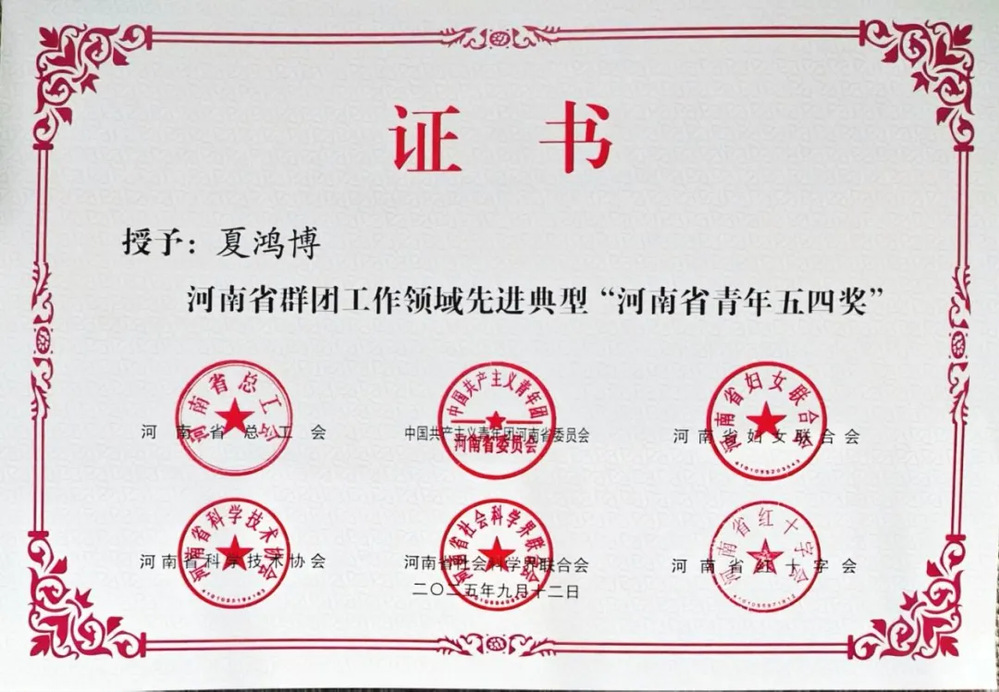 (车宇航/文图)近日,河南省总工会、团省委、省妇联等联合开展河南省群团工作领域先进典型评选表彰活动,研究院智能焊接装备与制造研究所副研究员夏鸿博荣获“河南省青年五四奖”。