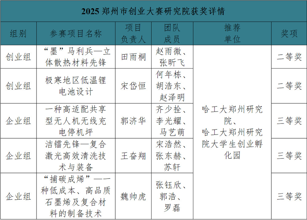 (吴江飞/文 孙亚文/图)近日,由郑州市人力资源和社会保障局联合郑州市总工会、共青团郑州市委、郑州市妇女联合会、郑州市残疾人联合会共同主办的“2025郑州市创业大赛(决赛)暨郑州创客节”在郑州市创业孵化园成功举办。研究院双创基地入驻项目凭借扎实的科研功底和优秀的创新能力,经过激烈角逐在决赛中脱颖而出,最终斩获创业组二等奖2项、企业组三等奖3项,5个参赛项目均取得成绩并作为优秀项目在郑州创客节参加展览。