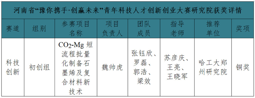 (吴江飞/文 孙亚文/图)近日,由省委人才办、团省委、省科技厅主办,郑州航空港区承办,中国工商银行河南省分行协办的河南省“豫你携手·创赢未来”青年科技人才创新创业大赛闭幕式在郑州航空港区举行,研究院双创基地入驻项目“CO2-Mg短流程批量化制备石墨烯及复合材料新技术”在省决赛中荣获铜奖。
