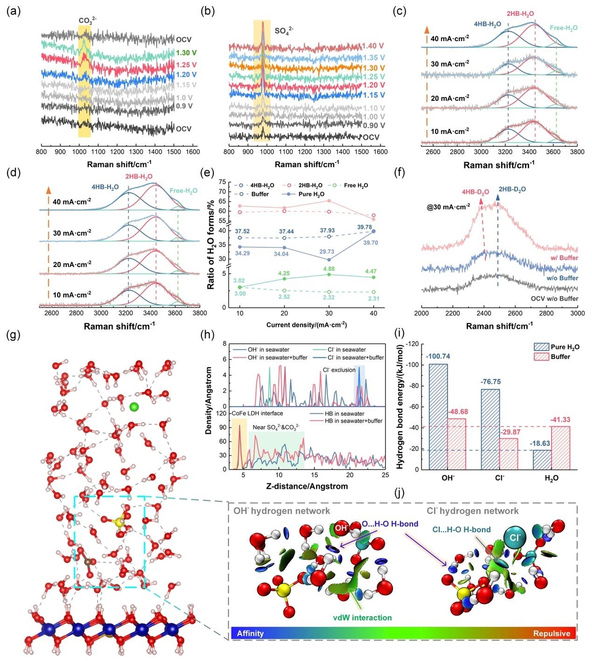 海水直接电解制氢技术是我国深远海风电破局的关键,也是拓宽氢源供应渠道、解决电解制氢高纯水依赖性的重要技术路线,但阳极材料易遭受氯离子带来的腐蚀,向电解质中引入阴离子可有效缓解腐蚀强度和速率。然而,当前研究普遍认为抑制Cl-的机制为静电排斥作用,即双电层内的高价阴离子通过库仑力排斥Cl-,同时允许OH-传输。这种静电排斥机制将界面水视为被动介质,忽略了其动态分子行为。更关键的是,这种机制无法解释“OH-和Cl-带有同种电荷但仅有Cl-被排斥”的实验现象。