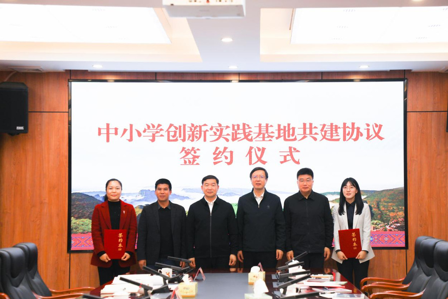 在谭玉成、陈杰的见证下,我校和金秀县相关部门负责人签署中小学创新实践基地共建协议。根据协议,双方将以实践基地为载体,依托我校优质教育科研资源,全面提升金秀中小学科学教育和创新能力培养水平,助力金秀教育事业高质量发展。