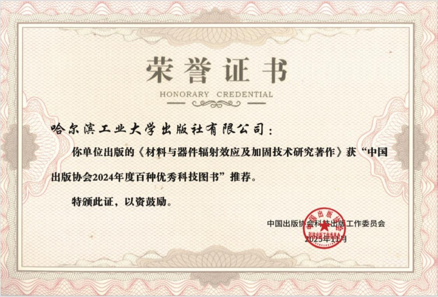 哈工大全媒体(王晨阳 马静怡/文 刘乐/图)近日,“中国出版协会2024年度百种优秀科技图书”推荐书目正式发布,哈工大出版社出版的《材料与器件辐射效应及加固技术研究著作》成功入选。