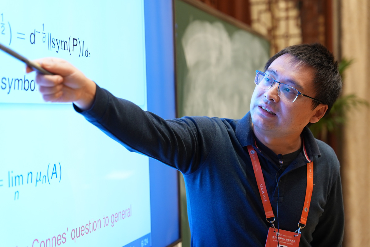 熊枭在以《拟微分算子的谱渐近性及其应用》为题的主旨报告中,从非交换几何的基本框架出发,阐述谱渐近极限在该理论体系中的关键作用,系统分析拟微分算子的黎曼Zeta函数之解析性质,由此推导出谱渐近极限的一般表达式,并展望谱渐近极限与“量子霍尔效应”及“积分态密度”等物理学热点之间的内在联系。
