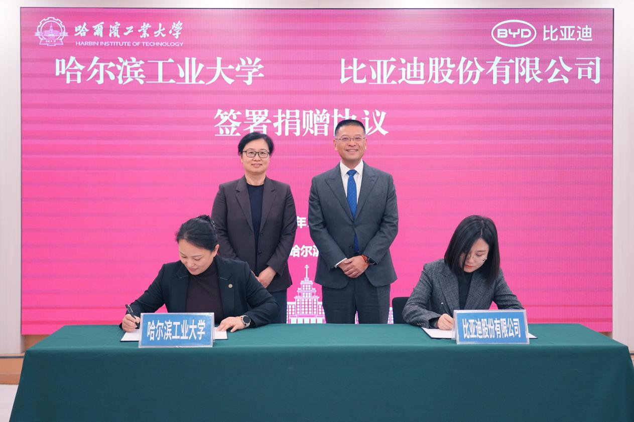 哈工大全媒体(梁英爽/文 辛然/图)1月9日,哈工大教育发展基金会捐赠签约仪式举行。比亚迪股份有限公司(简称“比亚迪”)向基金会捐赠,用于支持一校三区比亚迪奖学(教)金项目。校党委书记、教育发展基金会理事长陈杰会见比亚迪采购处总经理王渤一行。常务副校长、基金会副理事长孙雪为比亚迪颁发杰出教育贡献奖奖牌和捐赠证书,并见证比亚迪与我校签署捐赠协议。