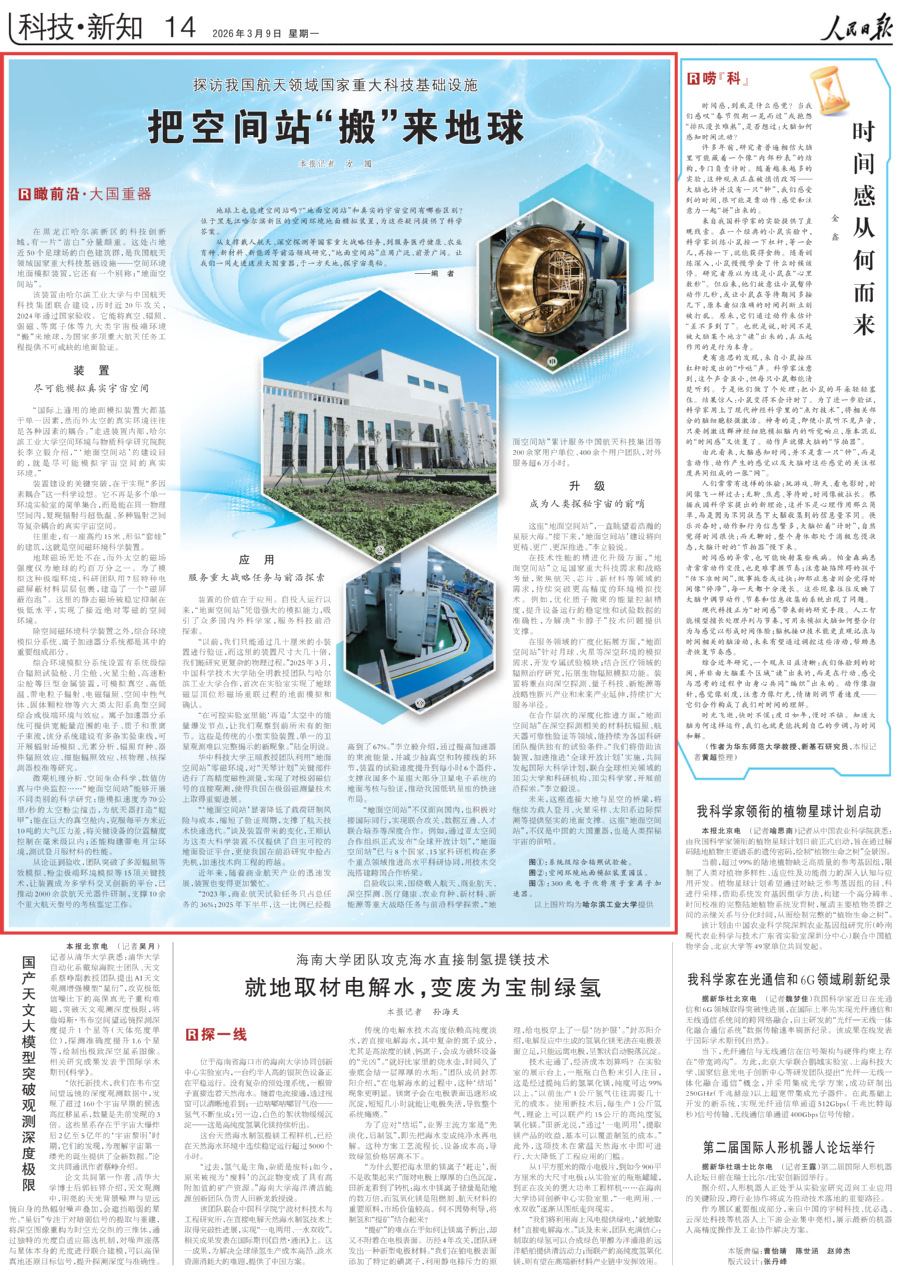 哈工大全媒体(李双余/文)3月9日,《人民日报》刊发《探访我国航天领域国家重大科技基础设施 把空间站“搬”来地球》,报道我校与中国航天科技集团联合建设的空间环境地面模拟装置把空间站“搬”来地球,支撑载人航天、深空探测等国家重大战略任务,服务医疗健康、农业育种、新材料、新能源等前沿领域研究。