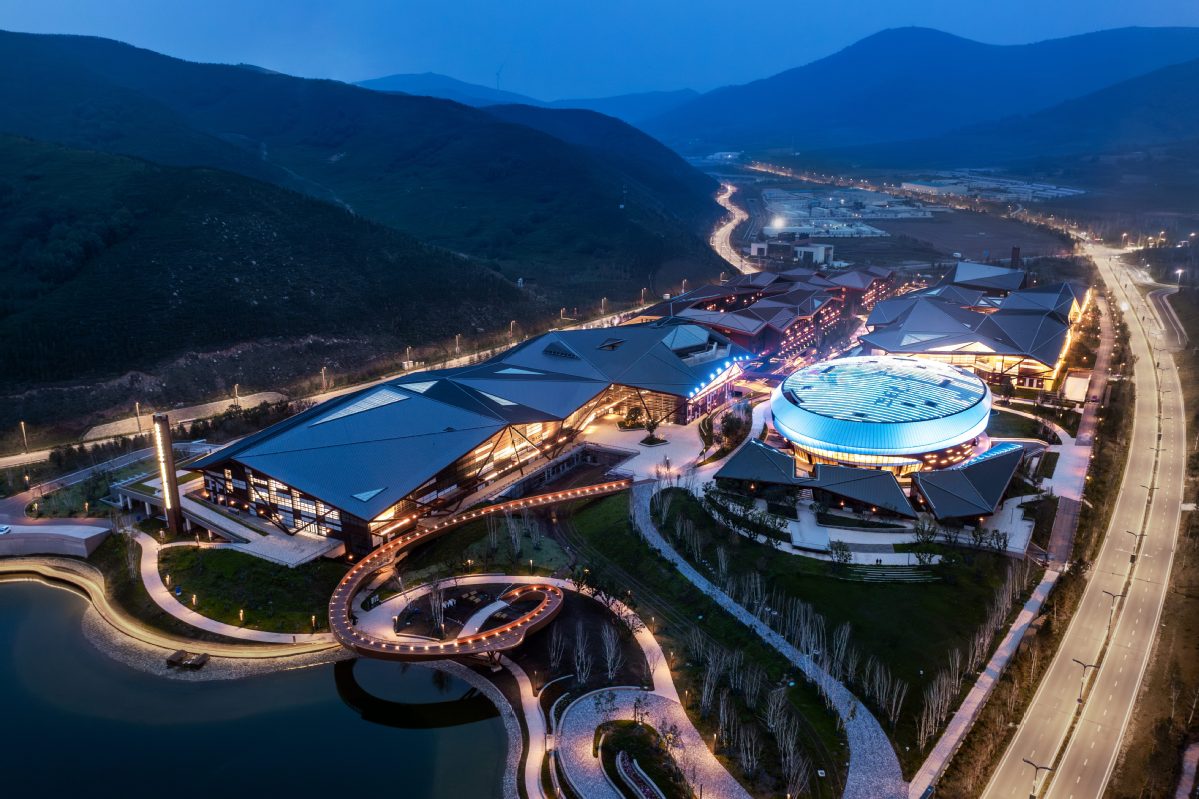 在生态环境共融方面,设计最大程度尊重崇礼得天独厚的原生地貌,延续两山夹一谷的山地特色,依山就势,整合高差、水系和景观,营造建筑与自然交织的空间场域,使建筑成为山体脉络的有机延伸;硬朗简洁的三角形折板屋面便于避风导雪、减小雪荷,与刚劲有力的立面支撑钢架共构起伏连绵、错落有致的聚落形态,再现中国传统建筑“架木为屋”的文化精髓和崇礼连绵雪山的冰雪特色。在空间多元群构方面,项目统合了会议、会展、酒店、商业、餐饮的全域全时业态,并以廊桥和地下阳光暖街将不同功能聚落进行串联,化解严酷气候对公共生活的阻隔,也为赛后的可持续运营与区域长远发展,树立了冰雪特色建筑群的新标杆。在创新技术驱动方面,项目通过复杂建筑系统的先进技术集成,确保了低能耗运行与高清洁能源利用效率,攻克了大跨度复杂造型与山地融合的技术难题,提供了TOD模式与智慧疏导系统相结合的寒地大型文旅项目交通组织新范式,不仅保障了冬奥高标准服务,更成为推动绿色建造、智能建筑技术迭代的可持续新范式。