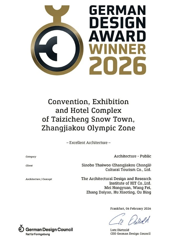 哈工大全媒体(刘培香 资产公司 设计院公司 文/图)近日,由我校梅洪元院士领衔主创、哈工大建筑设计研究院有限公司设计完成的北京2022年冬奥会张家口赛区太子城冰雪小镇国际会展中心、会议中心及酒店项目荣获2026德国国家设计奖(German Design Award)优胜奖。