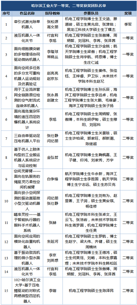 荣获大赛季军的项目团队由我校机电工程学院博士生王文涵、滕道竣和硕士生黄兆启、张津铭及黑龙江科技大学硕士生丁耀杰组成,机电工程学院张松源副研究员、生命科学和医学学部高文朋副教授担任团队指导教师。我校获一、二等奖团队学生分别来自机电工程学院、航天学院、未来技术学院和威海校区。