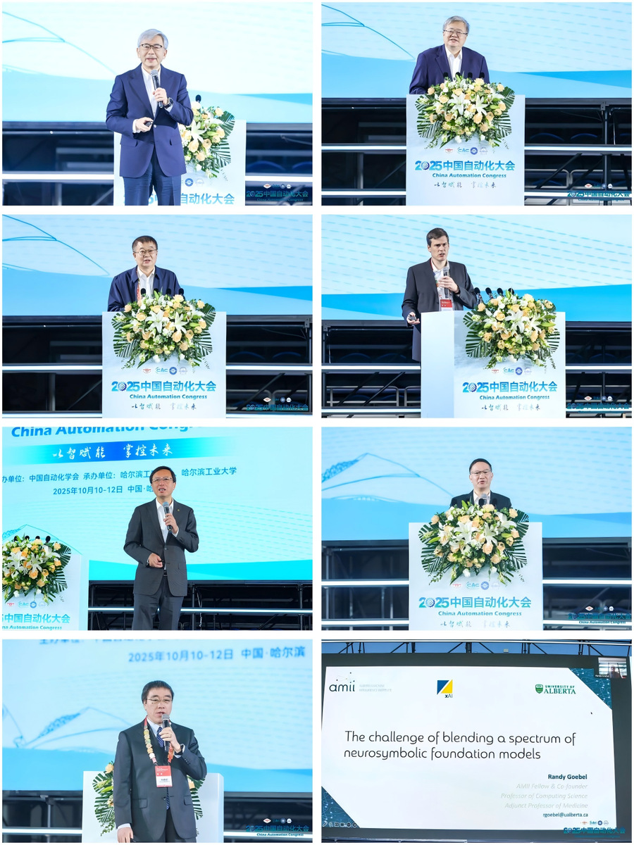 郑南宁、于海斌、夏桂华、本杰明·霍穆特、陈杰、王耀南、何春明、阿尔伯塔大学教授兰迪·戈贝尔(Randy Goebel)先后以《从概念生成到意图驱动的智能》《人工智能时代的制造自动化》《船舶数字孪生技术研究及在无人船编队控制中的应用》《PLCnext Technology——新一代开放自动化控制平台》《生物群体启发下的无人系统合作演化与群智涌现》《具身智能机器人感知与控制前沿技术》《破局与增效 人工智能重构工业控制系统》《混合多种神经符号基础模型的挑战》为题作大会主旨报告,分享自动化领域最新研究成果,深入探讨行业发展趋势与创新路径。