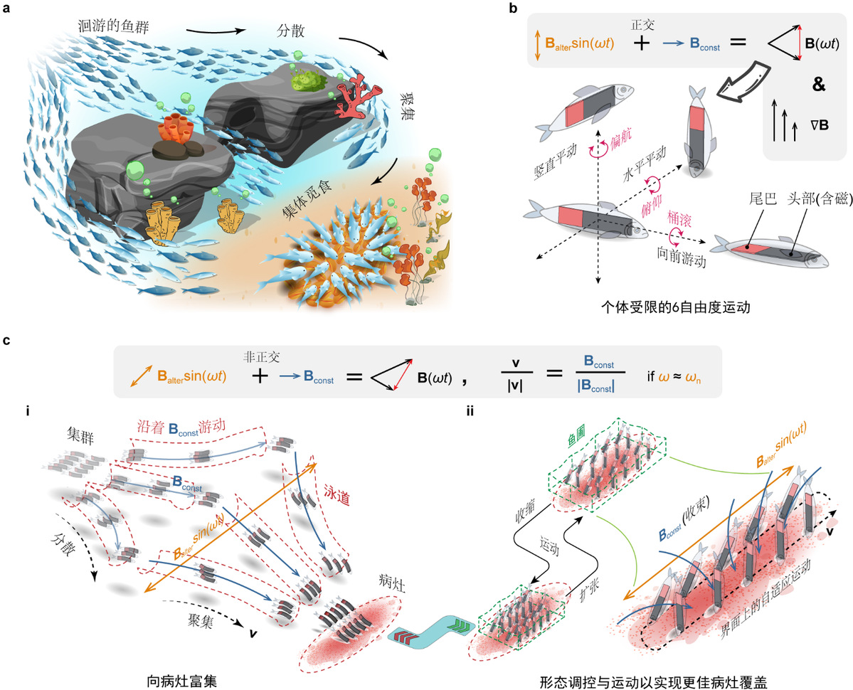 体内病变往往呈现多点散发、立体分布的特征,而单个微型机器人尺寸微小,难以覆盖病变区域,限制了药物递送的效率。因此,需要通过群体协作弥合单个机器人与病变区域范围之间的鸿沟。自然界中,鱼群通过协同行为适应复杂环境,为解决这一问题提供了仿生学启示(图1)。洄游鱼群通过动态聚散穿越复杂通道,觅食鱼群则在特定区域调节形态以覆盖目标。然而,要让机器人在体内环境实现类似的群体协同行为却面临“如何在全局磁场下实现个体差异化控制”“如何调节机器人间的距离避免相互粘连”“如何使机器人群体自适应地贴附于不规则病灶”等诸多挑战。