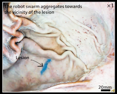 图1 灵活的微型仿鱼磁性软机器人集群向病灶聚集并形状自适应贴附