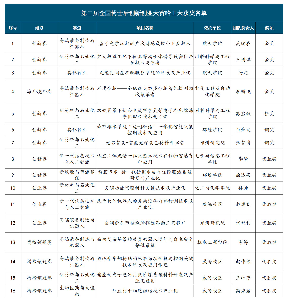 哈工大全媒体(商艳凯 人事处/文)近日,第三届全国博士后创新创业大赛总决赛在福建泉州举行。我校参赛博士后团队凭借扎实的科研功底和卓越的创新能力,在众多高水平项目中脱颖而出,最终斩获4金1银2铜及9项优胜奖,获奖项目覆盖全部组别与多个赛道,获得金奖数量位居参赛队伍前列,创造我校参加该项赛事以来的历史最好成绩,充分展现了我校博士后人才的创新活力与创业潜能。