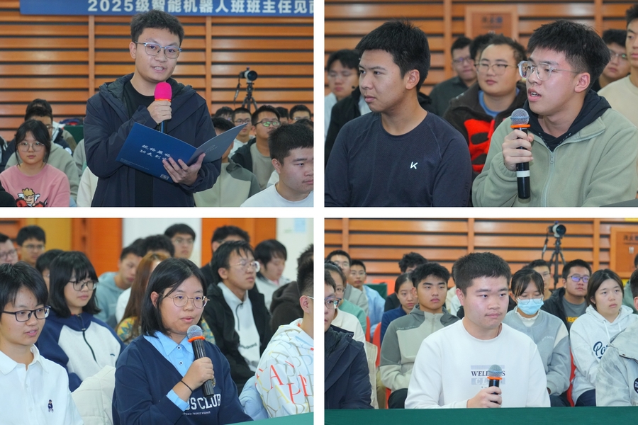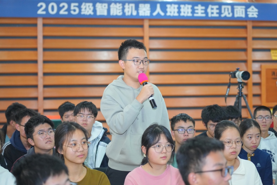 “这段时间,我们听了好几场特别有收获的讲座,近距离接触到了科研领域的‘真东西’……”“在学长学姐的先进事迹报告会中,听他们分享自己的经历和感悟,更明白了如何向着自己的目标努力……”见面会上,智能机器人班25TS201班长周泓伽汇报了入学两个月来开展学习、文体活动、社会实践等方面的情况和同学们的收获。同学们结合自身成长话题积极提问,刘宏院士逐一耐心解答。
