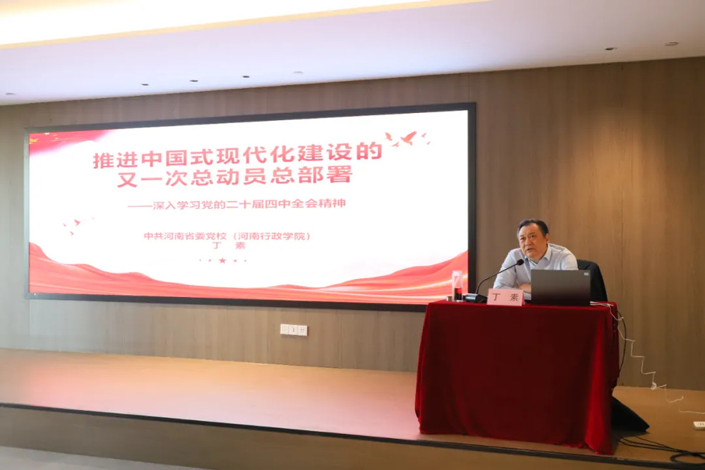(车宇航/文 杨贝/图)为深入学习贯彻党的二十届四中全会精神,持续强化理论武装,推动全会精神落地生根,11月21日,研究院联合河南网络广播电视台共同组织开展专题培训。培训邀请中共河南省委党校(河南行政学院)原教育长、党组成员丁素教授来院开展题为《推进中国式现代化建设的又一次总动员总部署——深入学习党的二十届四中全会精神》的专题讲座。研究院院长刘铭辉参加培训并作学习动员。河南网络广播电视台有限公司董事长时伟参加学习交流。研究院院务委员张宏主持。