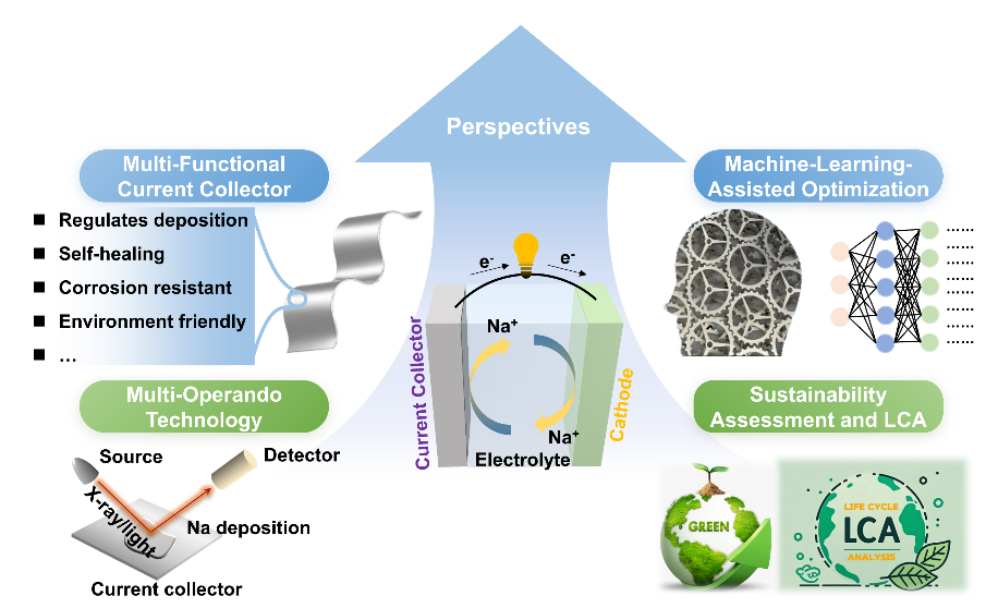 无阳极钠离子电池因具有高能量密度和良好安全性而成为有前景的储能技术,其性能高度依赖集流体设计。目前研究主要通过亲钠表面改性和多维结构设计提升集流体性能。为实现商业化,未来重点包括多功能集成设计:发展兼具钠沉积调控、自修复、耐腐蚀和环境友好等多功能一体的集流体,并配套低成本、可规模化制备工艺;机器学习辅助优化:结合大数据筛选与多物理场建模,高效设计具有优良亲钠性、导电性及循环稳定性的集流体结构;多尺度原位表征联用:通过实时观测钠沉积行为与界面演化,揭示机制,为材料与结构设计提供依据;全生命周期评价:系统评估集流体从原料、制备到回收的全过程环境影响,确保其可持续发展属性。通过以上策略,AFSIBs集流体有望加速从实验室研究走向产业化应用,为下一代高性能、高安全钠电池发展奠定基础。