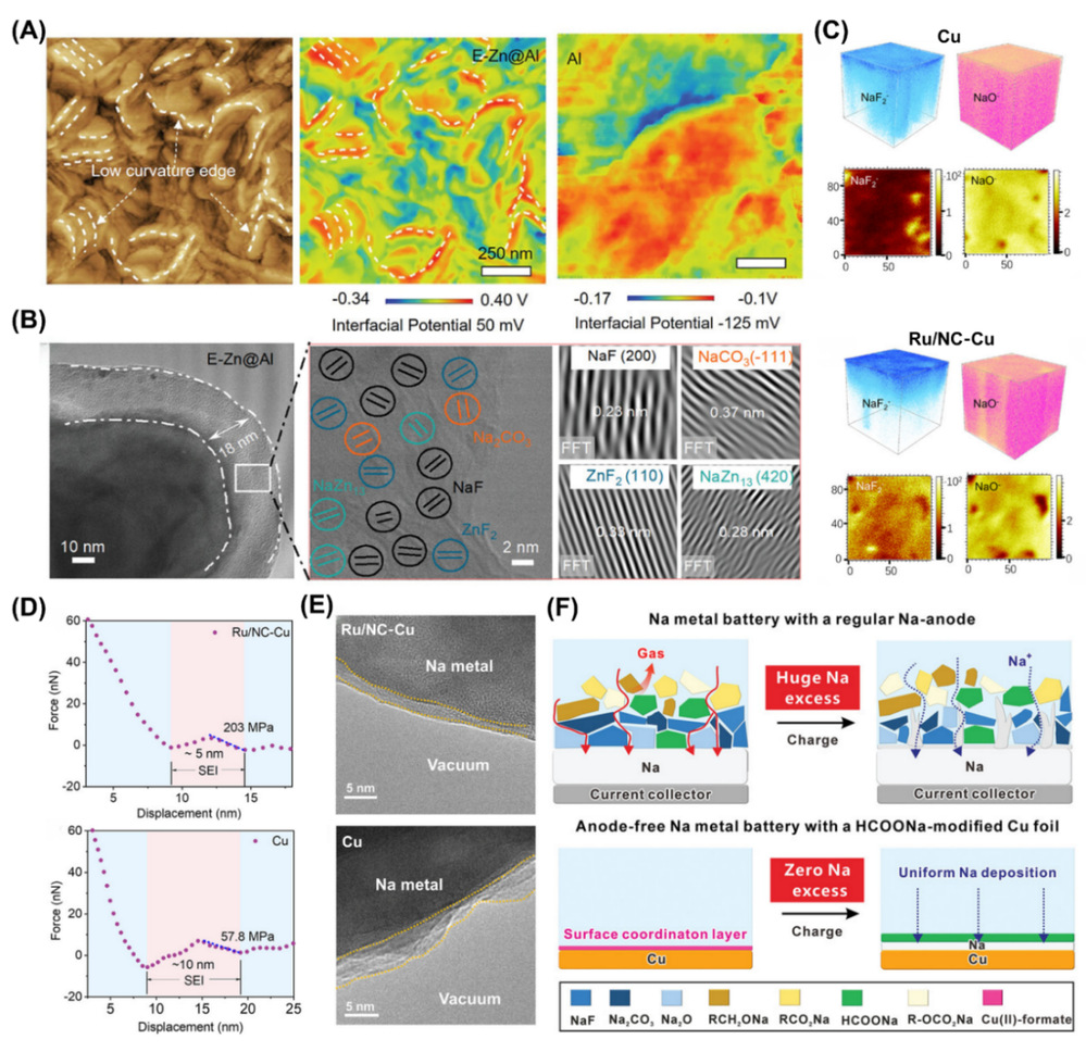 图3. (A) Al和 E-Zn@Al界面的开尔文探针力显微镜图; (B) Al 和 E-Zn@Al 上的 SEI 的成分、结构; Ru/NC-Cu 和 Cu 表面 (C) SEI 的组分分布、(D) 力曲线和 (E) Cryo-TEM 图像。(F) Na在载有/未载有HCOONa 界面的层在Cu表面的沉积机制。