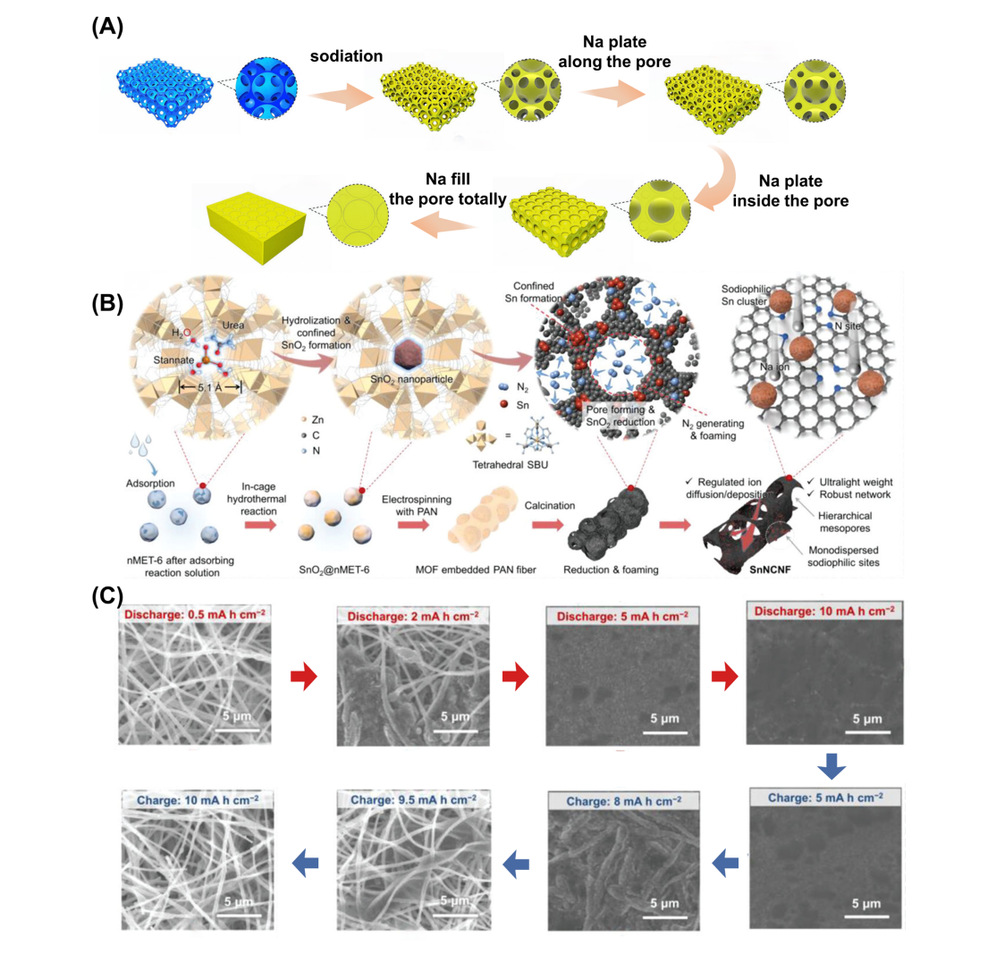 图4. (A) NiSA/QD@CFs镀Na示意图; (B) SnNCNF;