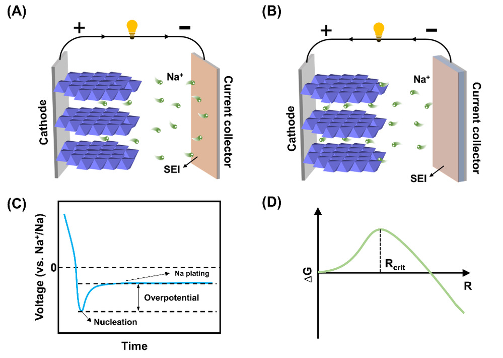 AFSIBs采用创新的“零负极”架构,在充放电过程中保持了与传统“摇椅式”电池相似的工作原理,通过钠离子在集流体表面的可逆电化学沉积构建动态金属钠负极。尽管其沉积-溶解行为与传统钠金属电池类似,但由于正极中Na⁺的供给量有限,电池性能受到明显制约。因此,集流体上钠的成核与生长行为、以及镀钠/剥离过程的可逆性,对电池的循环稳定性具有决定性影响。深入理解集流体表面的钠成核机制,对设计具有高效沉积/溶解能力和长循环寿命的集流体至关重要。本文通过对成核过程热力学行为的系统分析,明确指出小尺寸成核会引发三大问题:界面副反应加剧、SEI膜反复破裂与重组、以及枝晶生长恶化,并进一步提出通过构建亲钠界面层和设计三维多孔结构以优化钠沉积形态,最终强调实现对集流体的精准调控是保障AFSIBs高效稳定运行的核心关键。
