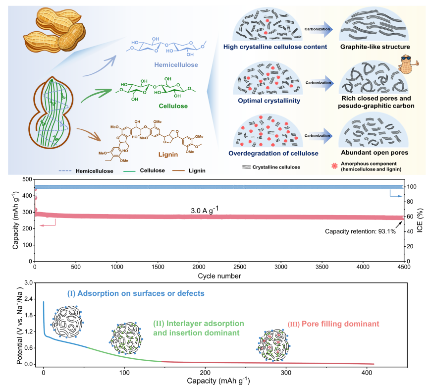 图2. 花生壳基硬碳材料的制备流程、性能表现以及储能机制